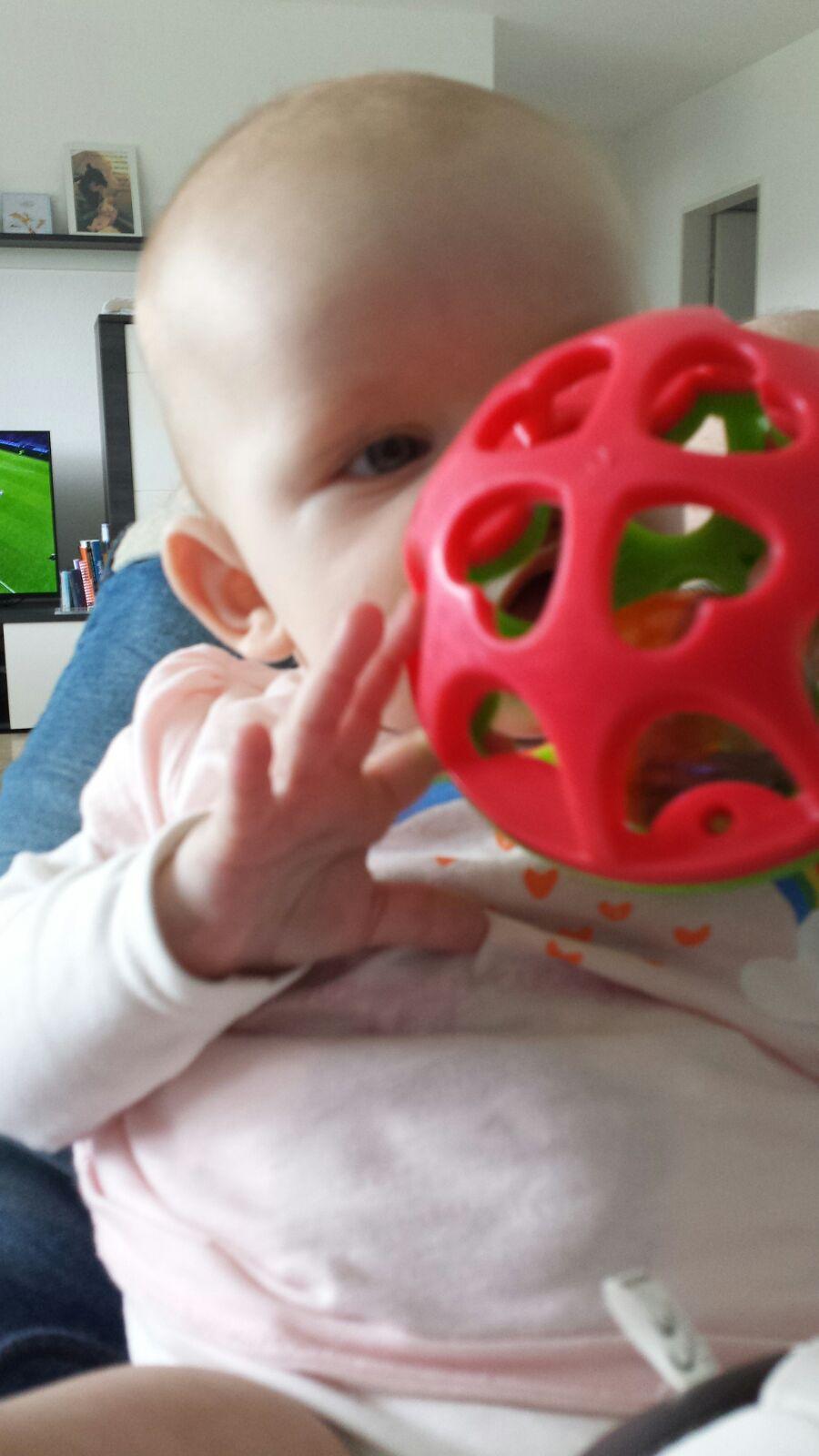 Unsere kleine Lena,5 Monate alt liebt Bälle über alles.Doch ganz oft klaut sie heimlich das Lego Duplo ihres Cousins und lächelt dabei über das ganze Gesicht.