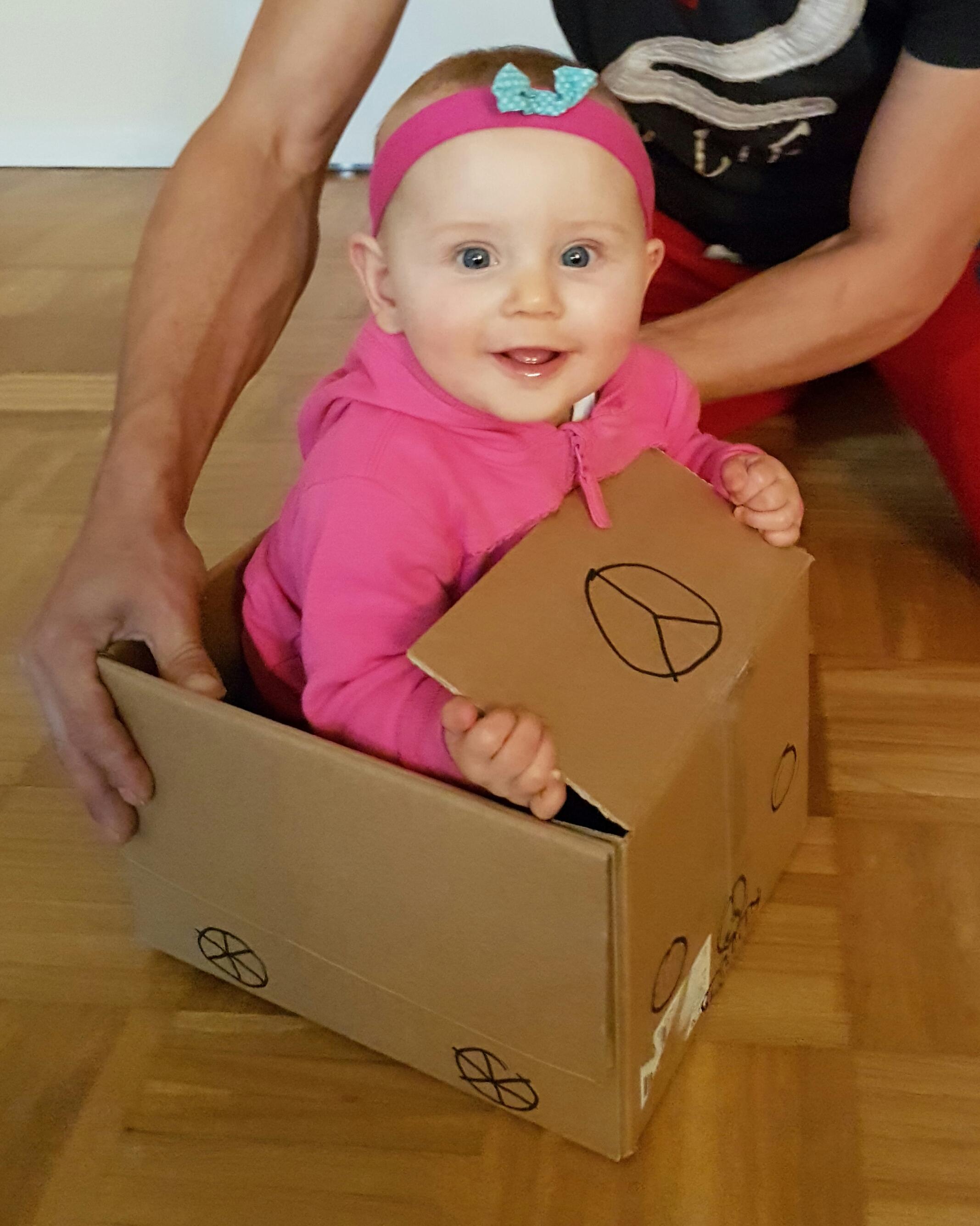 Eine fröhliche kleine Maus beim Kartonfahren