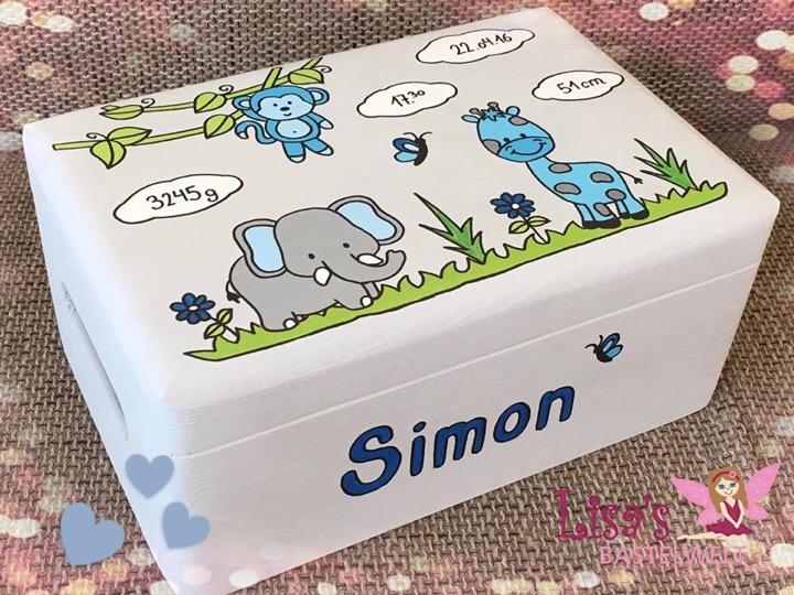 - Inhalt der bemalten Kiste: 22 Pampers, 4 Babylöffel, 3 Fencheltee, 1 Schnuller, 1 Pack Feuchttücher, 1 Shampoo, 1 Hipp Babycreme und 1 Schmusetier.