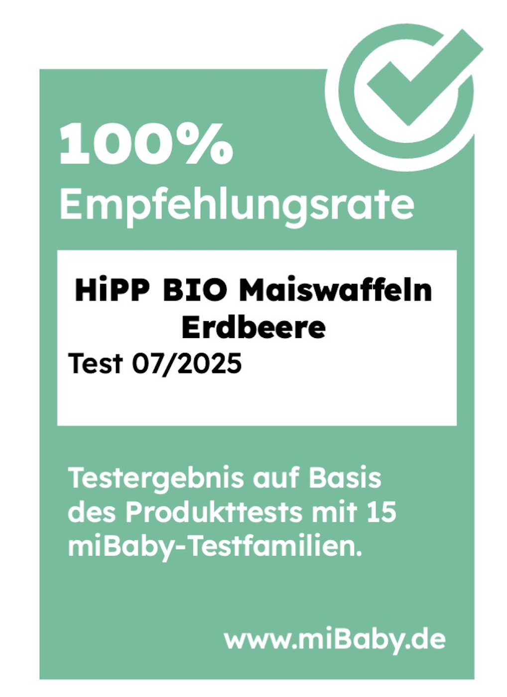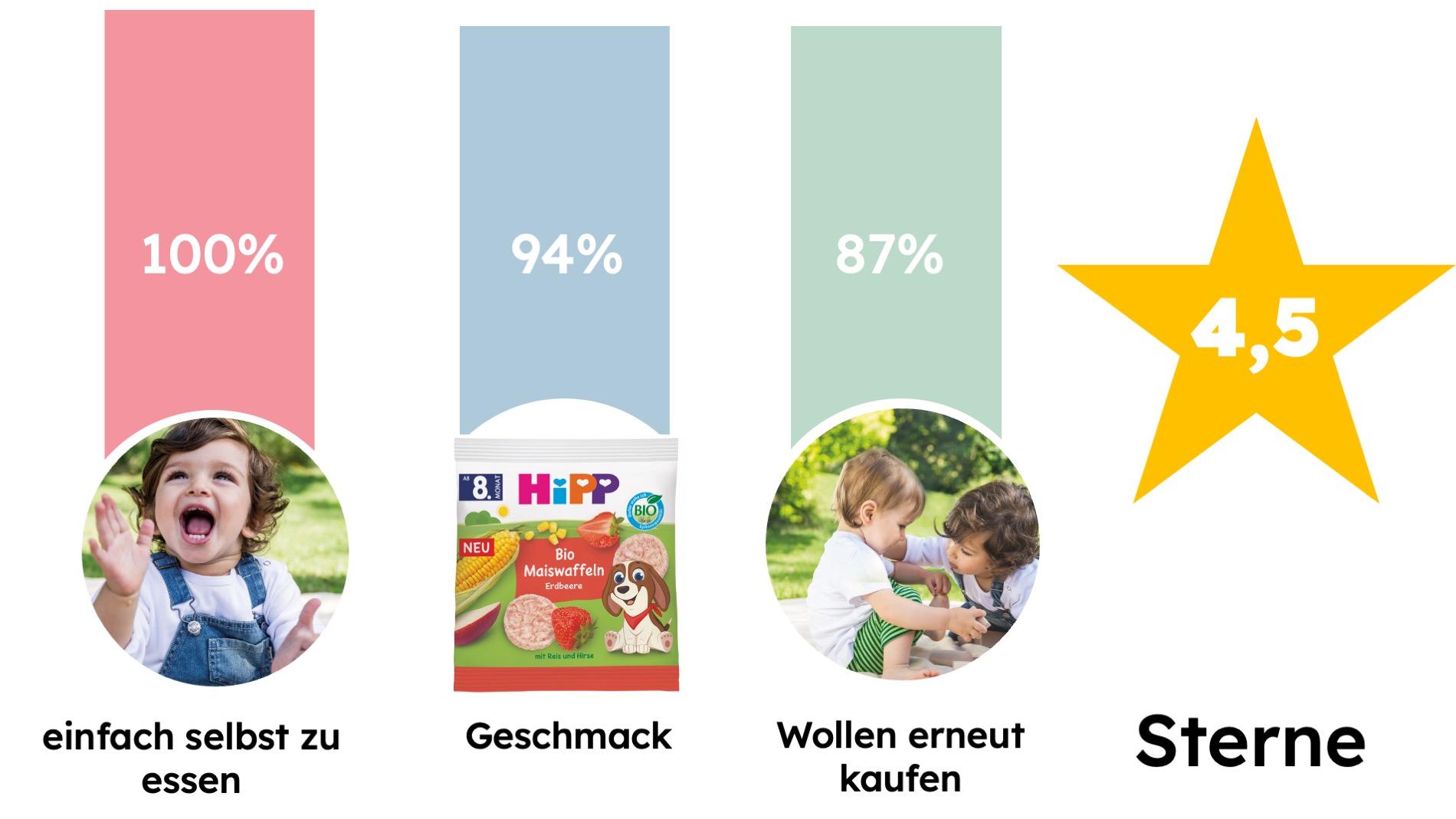 Ihr Fazit am Ende der Test-Phase: Weiterempfehlungsquote von 100% sowie 4,5 von 5 Sternen für die HiPP Bio Maiswaffeln Erdbeere.