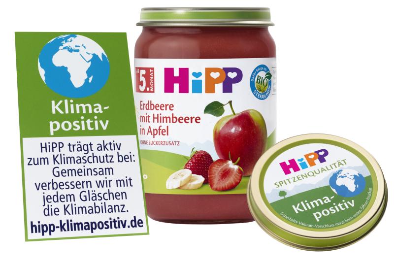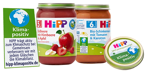 Als weltweit erster Babykosthersteller bietet HiPP damit Beikost-Gläschen an, die nicht nur eine neutrale CO₂ -Bilanz haben, sondern die sogar klimapositiv sind = mehr Treibhausgase als verursacht werden ausgeglichen.